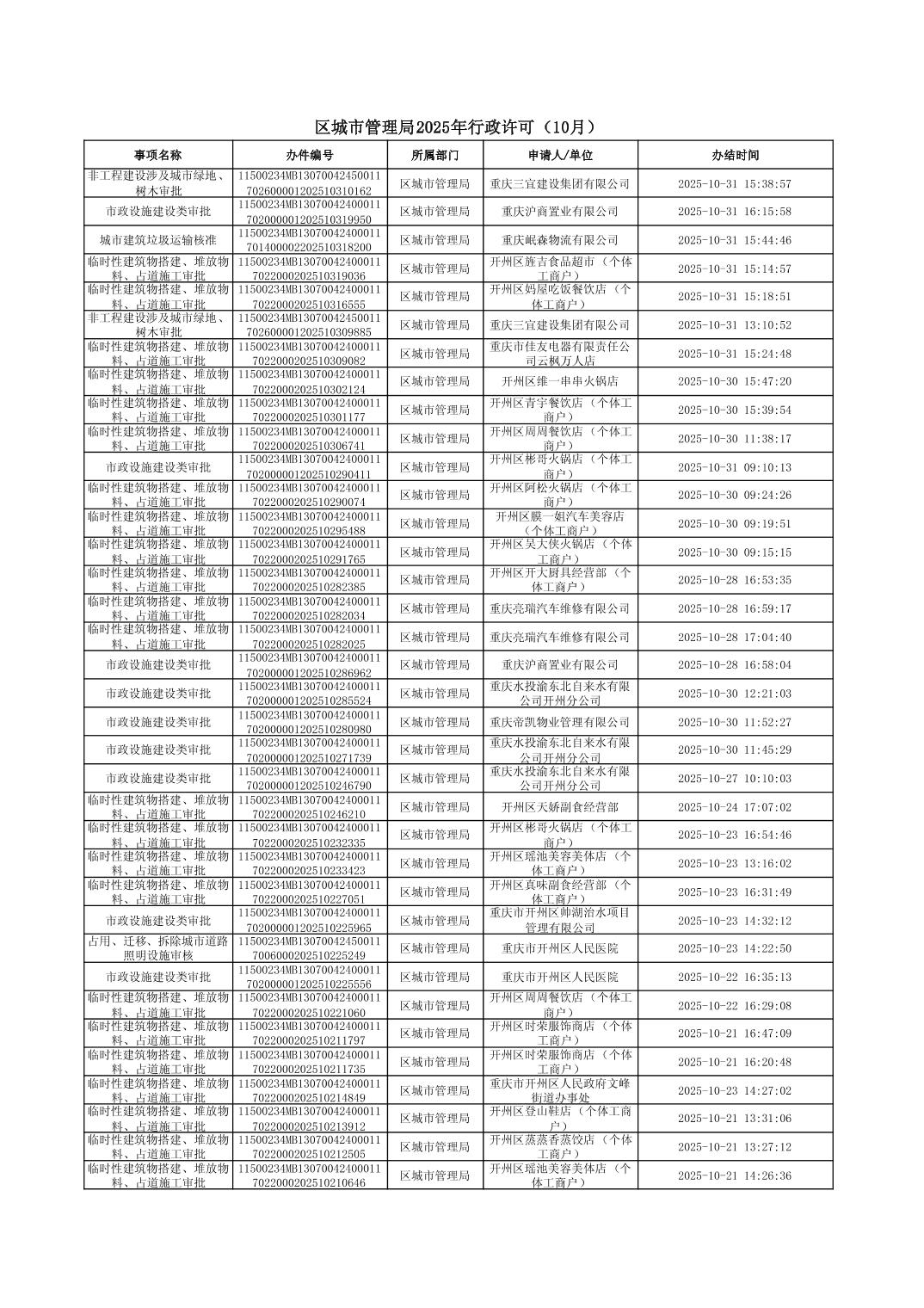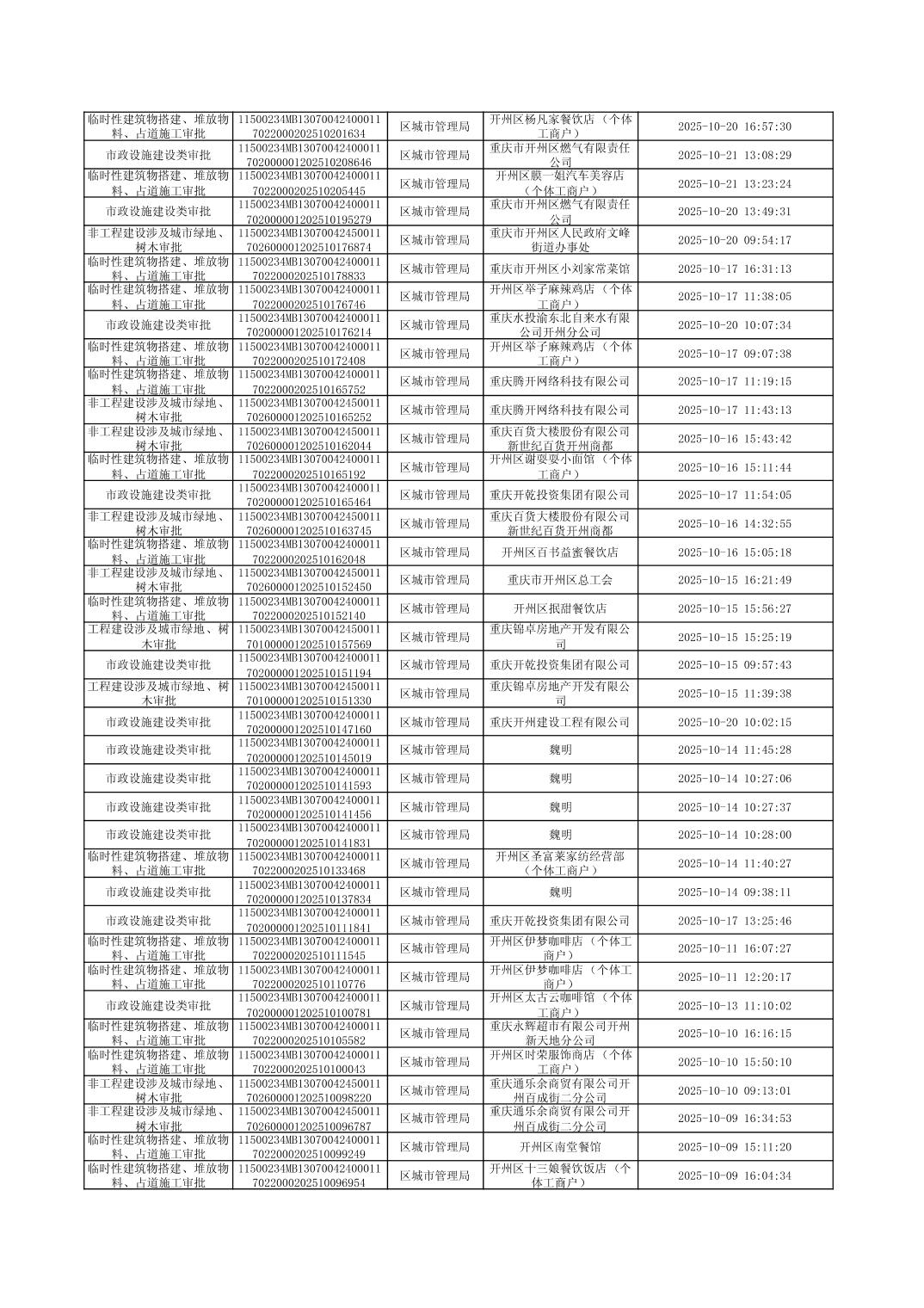 区城市管理局2025年行政许可(10月)