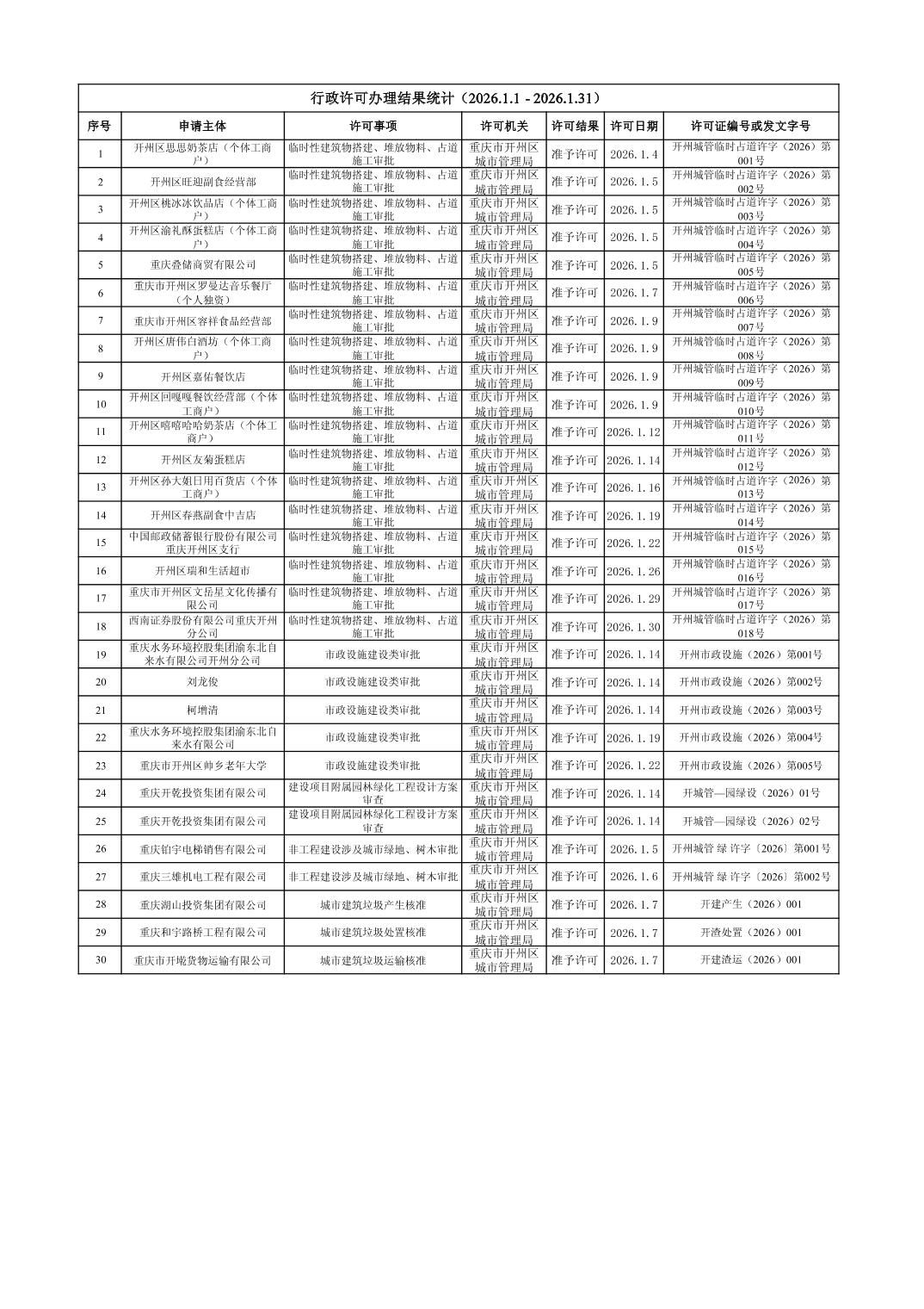 区城市管理局2026年行政许可(1月)