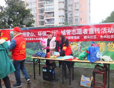 活动现场,滚动播放宣传《文明登山,环保随行》倡议书、《重庆市公园管理条例》,同时城市管理志愿者在现场进行文明劝导,沿途发放《文明登山,环保随行》倡议书、环保垃圾袋,同时开展拾捡垃圾等志愿服务活动,充分展示了志愿者良好的精神风貌和高尚的文明素养。