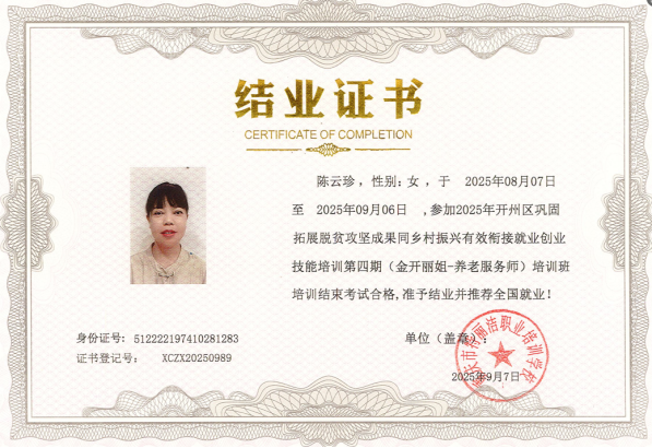 “左手持腕、右手托肘,翻身角度30°,防压疮先检查皮肤……”“以前靠力气打零工,如今靠技能拿高薪!”9月7日下午,随着最后一场实操考核结束,重庆市特丽洁职业培训学校二楼教室里掌声雷动,52名来自全区各乡镇(街道)的脱贫人口、监测对象、提低增收重点对象和本土实用人才顺利完成30天“金开丽姐—养老服务师”培训,拿到了印着“推荐全国就业”字样的结业证书。至此,我区2025年度巩固拓展脱贫攻坚成果同乡村振兴有效衔接就业创业技能培训第四期画下圆满句号。