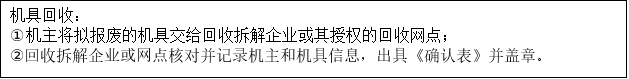 (一)回收确认。机主自愿将拟报废的农机交售给回收拆解企业或回收拆解企业授权的回收网点,回收拆解企业或回收网点应当核对机主和拟报废的农机信息,记录包括铭牌或其他能体现农机身份的有关资料,在《报废农业机械回收确认表(样式)》(附件3,以下简称《确认表》)上盖章确认。报废机具残值由农机回收单位与机主按照公平交易原则,共同协商确定。