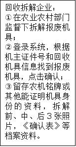 (五)报废拆解。乡镇(街道)核验通过后,报废农机回收点应及时将报废机具及《确认表》送往回收拆解企业,办理有关交接手续;回收拆解企业应定期对回收的报废农机具进行拆解,建立档案并上传报废农机信息,对国家禁止生产销售的发动机等部件进行破坏性处理。拆解档案应包括铭牌或其他能体现农机身份的有关资料,保存期不少于3年。各区县农业农村部门对本区县申请的报废农机拆解情况进行监督,确保每台报废农机完成报废拆解,不得再次流入市场。