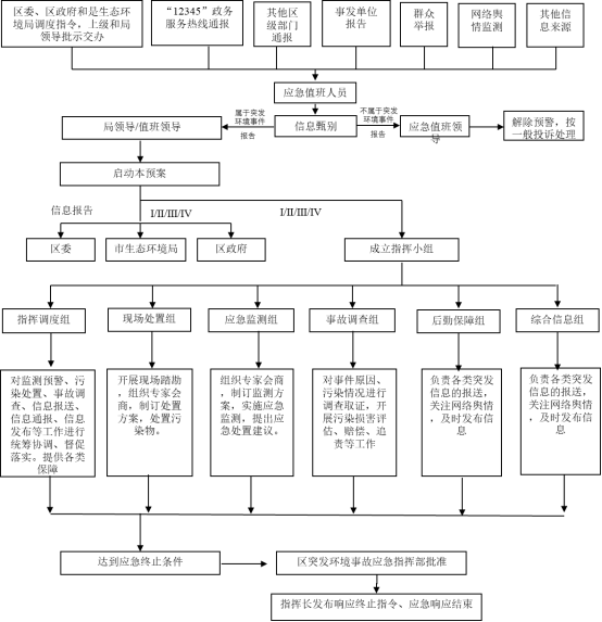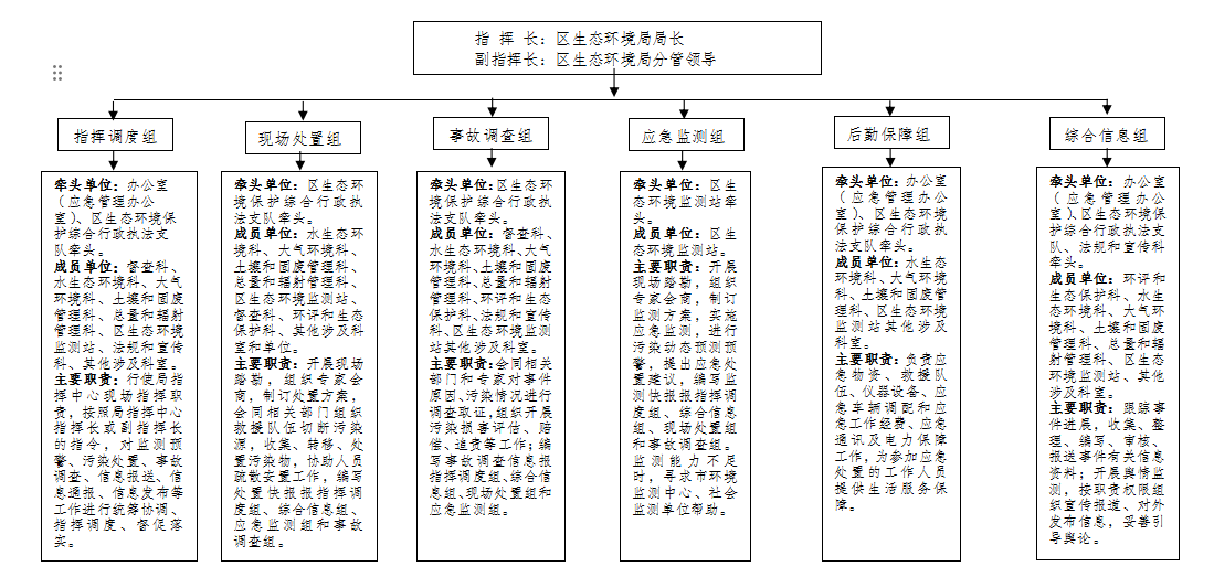 由区生态环境局统筹成立突发环境事件应急指挥中心(以下简称“局指挥中心”),实行指挥长负责制。由区生态环境局局长任局指挥中心指挥长,分管局领导任局指挥中心副指挥长;局指挥中心根据需要组织指挥调度组、现场处置组、应急监测组、综合信息组、后期保障组、事故调查组开展应急处置工作。局指挥中心职责、各工作组的成员单位职责见附则8.2。