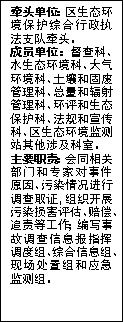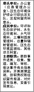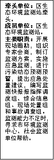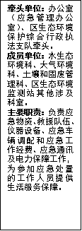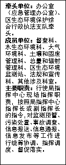 局指挥中心成员单位主要包括:局办公室(应急管理办公室)、督查科、法规和宣传科、水生态环境科、大气环境科、土壤和固废管理科、环评和生态保护科、总量和辐射管理科、区生态环境保护综合行政执法支队、区生态环境监测站。成员单位职责见附则8.3。