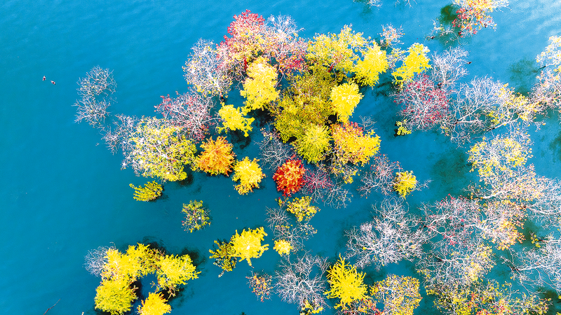 初冬时节,汉丰湖里水杉林与碧水相映成趣,形成了独特的“水上彩林”景观。