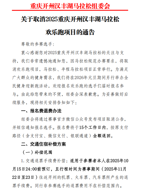 关于取消2025重庆开州汉丰湖马拉松欢乐跑项目的通告