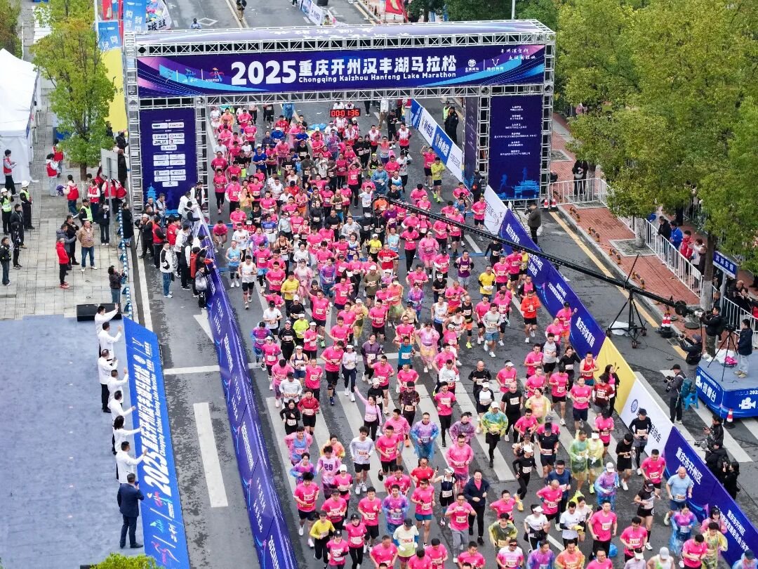 11月23日上午8点,“中国体育彩票”2025重庆开州汉丰湖马拉松鸣枪起跑。4000名跑者于“彩林叠翠,万鸟和鸣”的初冬时节,在汉丰湖旅游度假区,感受赛道的湖光山色和一座开州城的千年文脉。