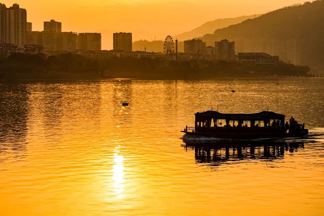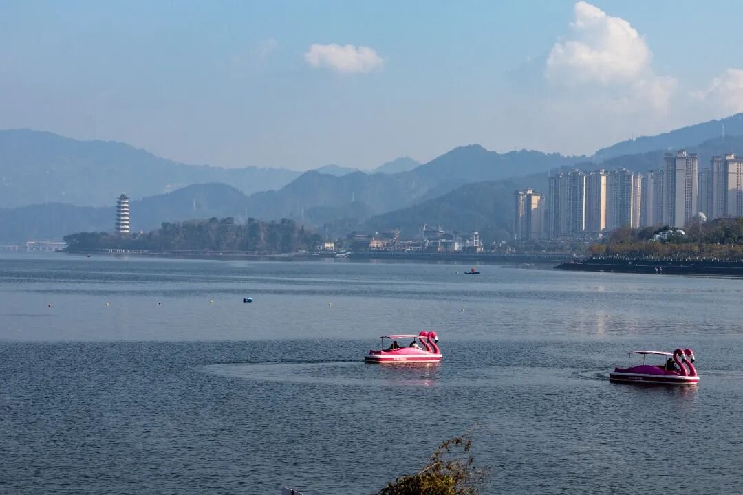 初冬的汉丰湖面,薄雾轻笼,画舫轻摇。湖面上,造型独特的“火烈鸟”游船格外引人注目。这个季节,汉丰湖迎来了最佳观鸟季,北方远道而来的候鸟在湖面嬉戏觅食。