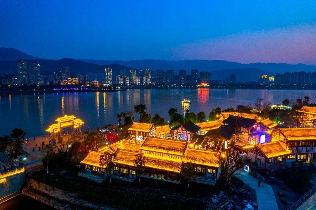 当夜幕降临,开州故城的灯光逐渐亮起。这座融合汉唐至近现代建筑风格的古城在夜色中展现出别样韵味。街道两旁是古色古香的建筑,游人可以在特色小店购买开州乡愁扇、秋沙鸭文创产品等纪念品。