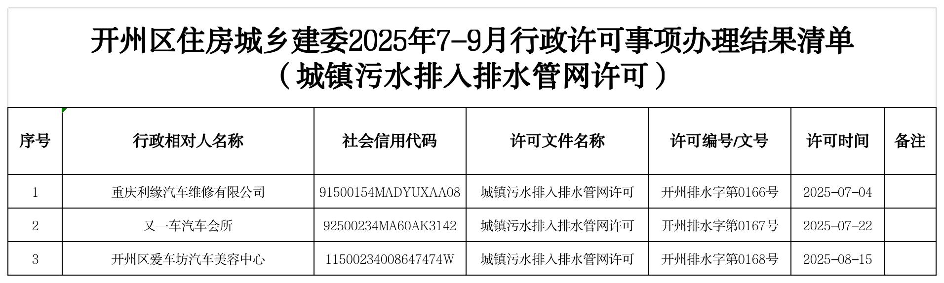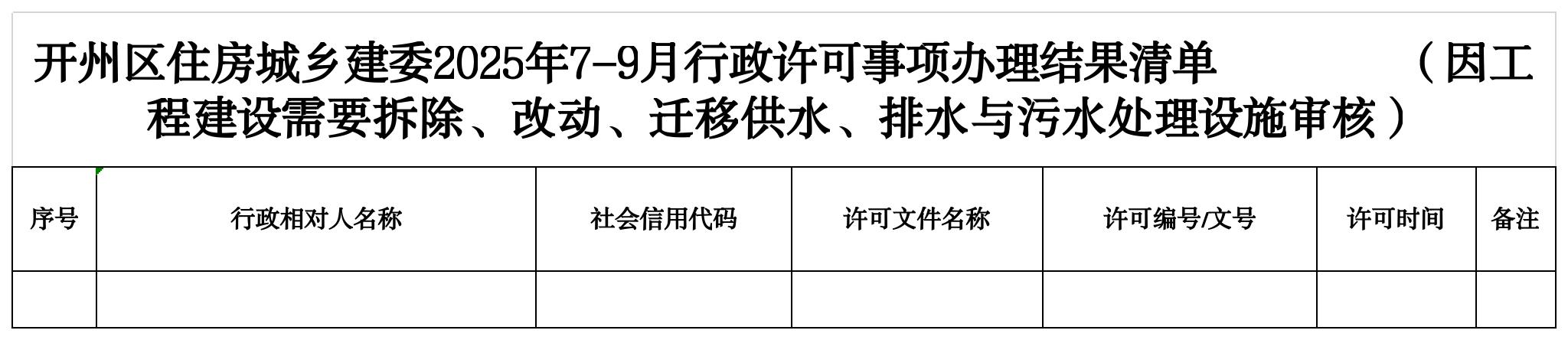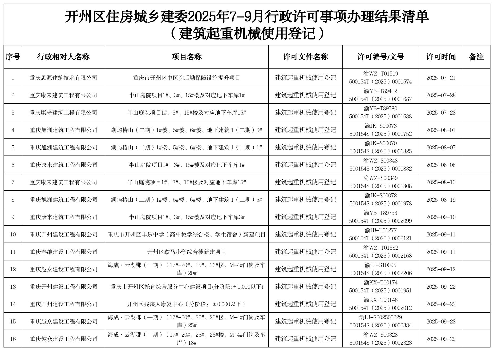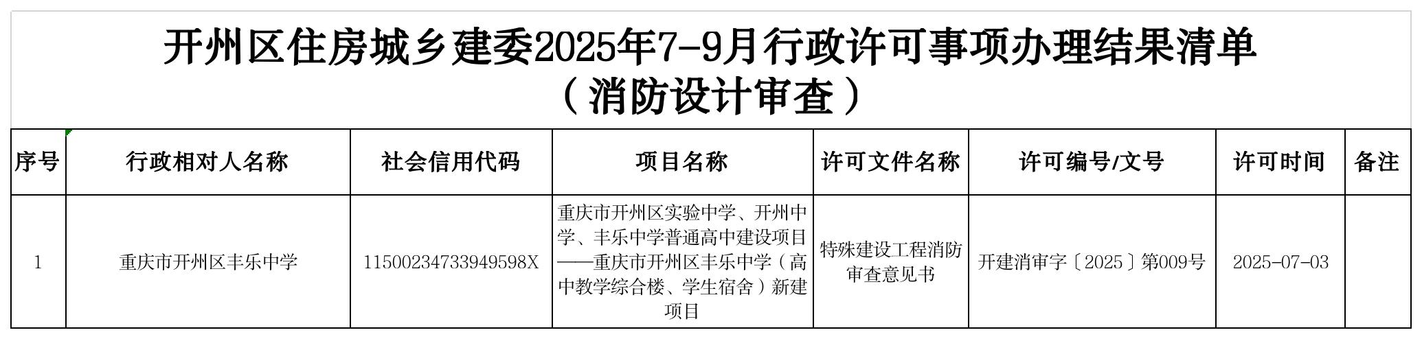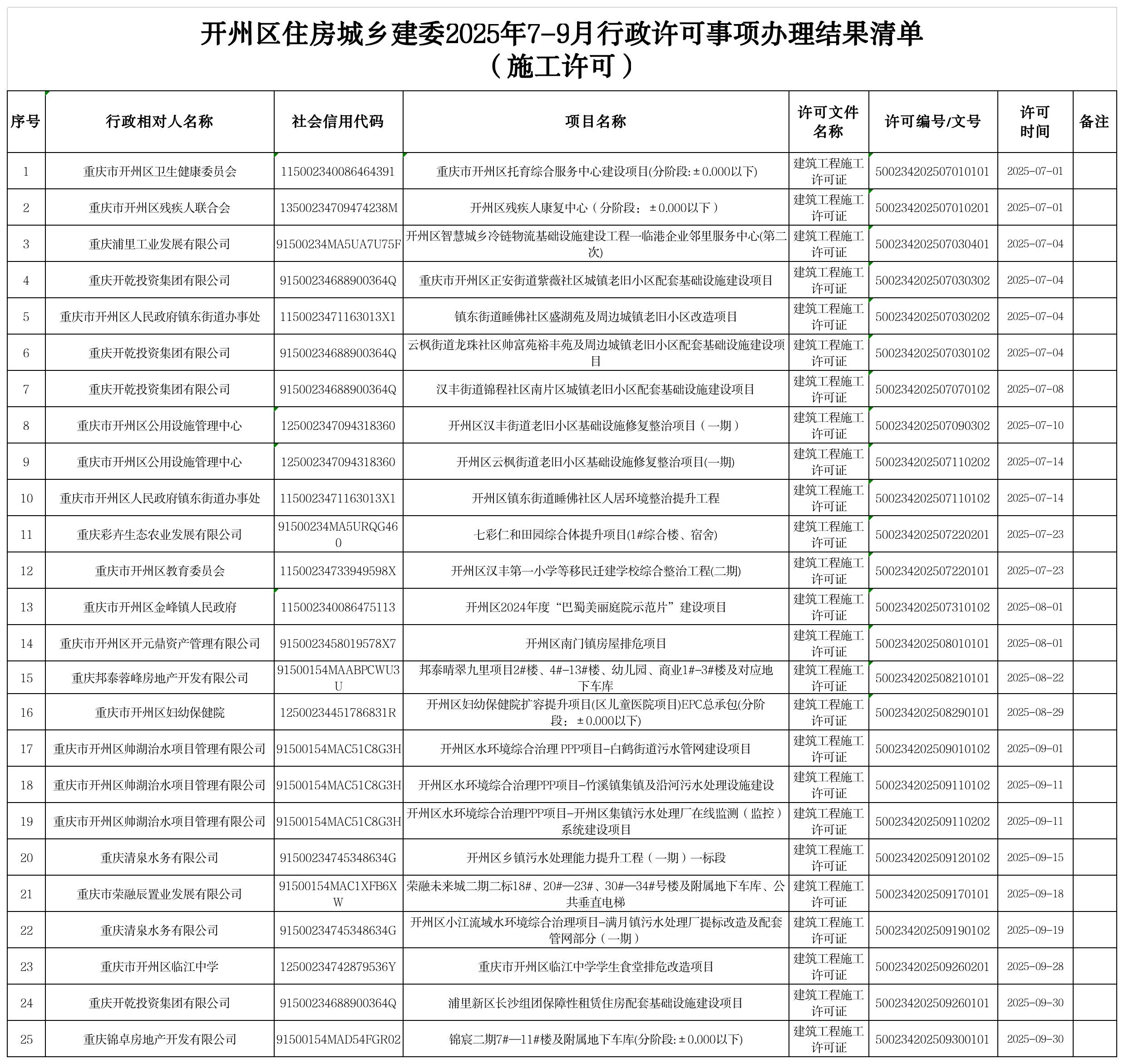 开州区住房城乡建委2025年7-9月行政许可事项办理结果