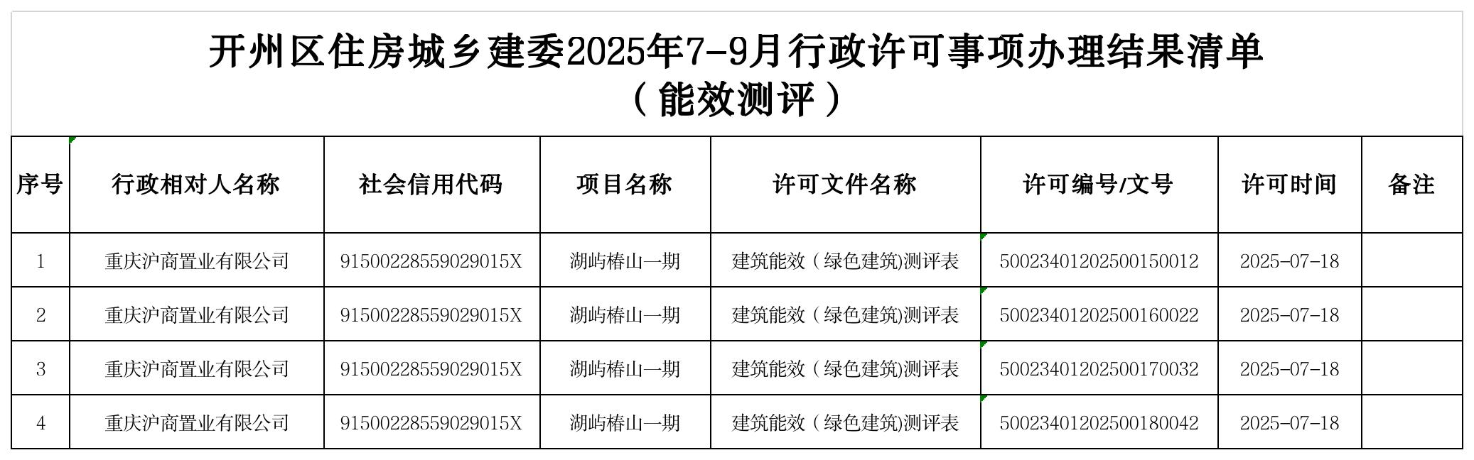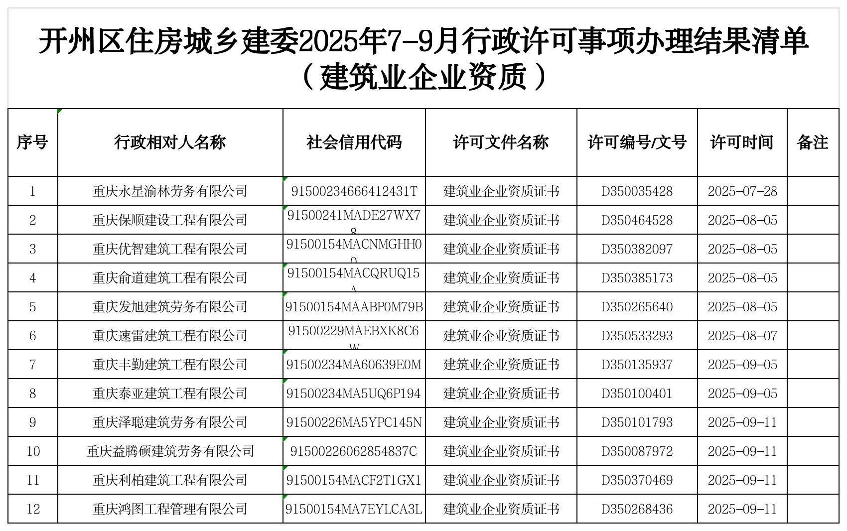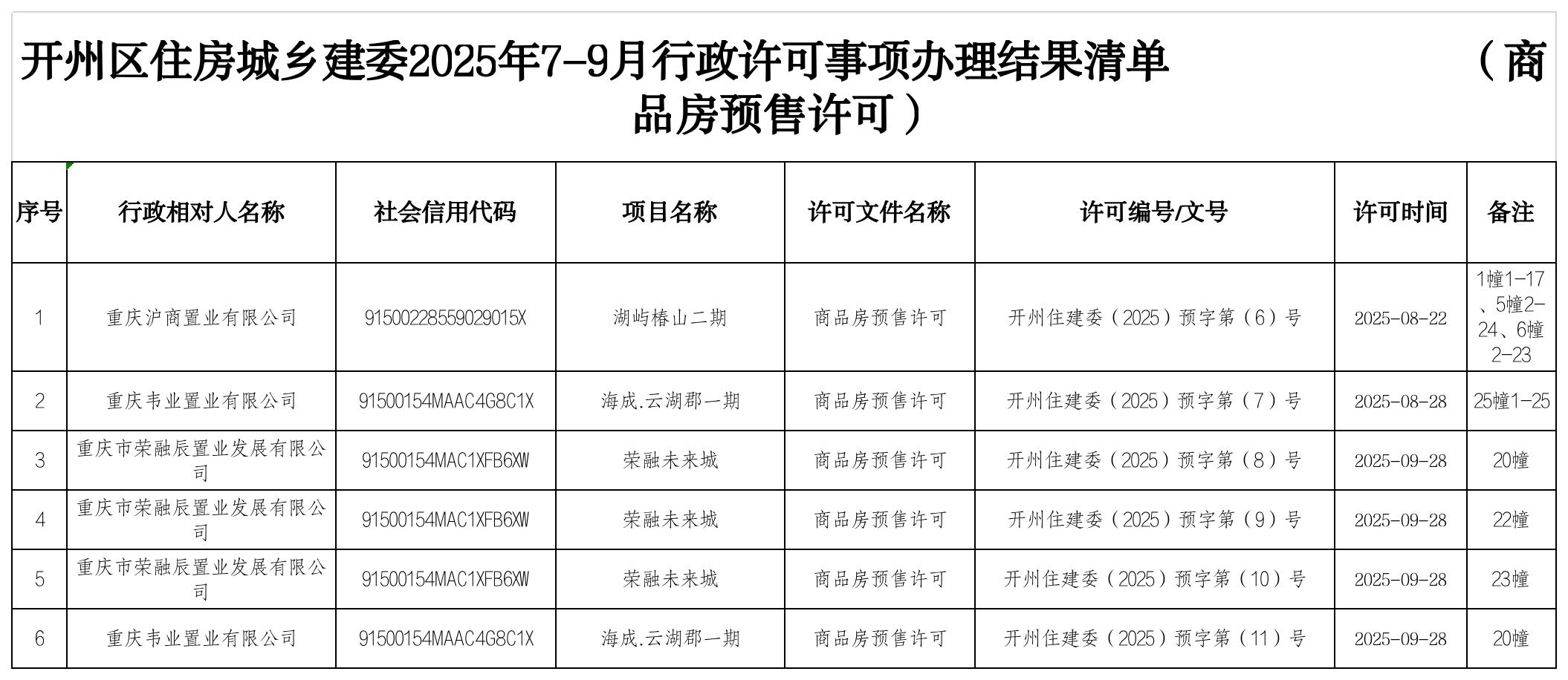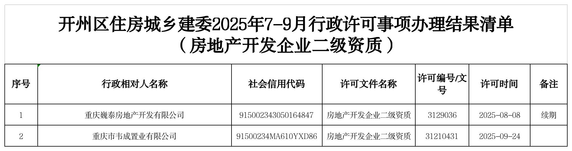 开州区住房城乡建委2025年7-9月行政许可事项办理结果