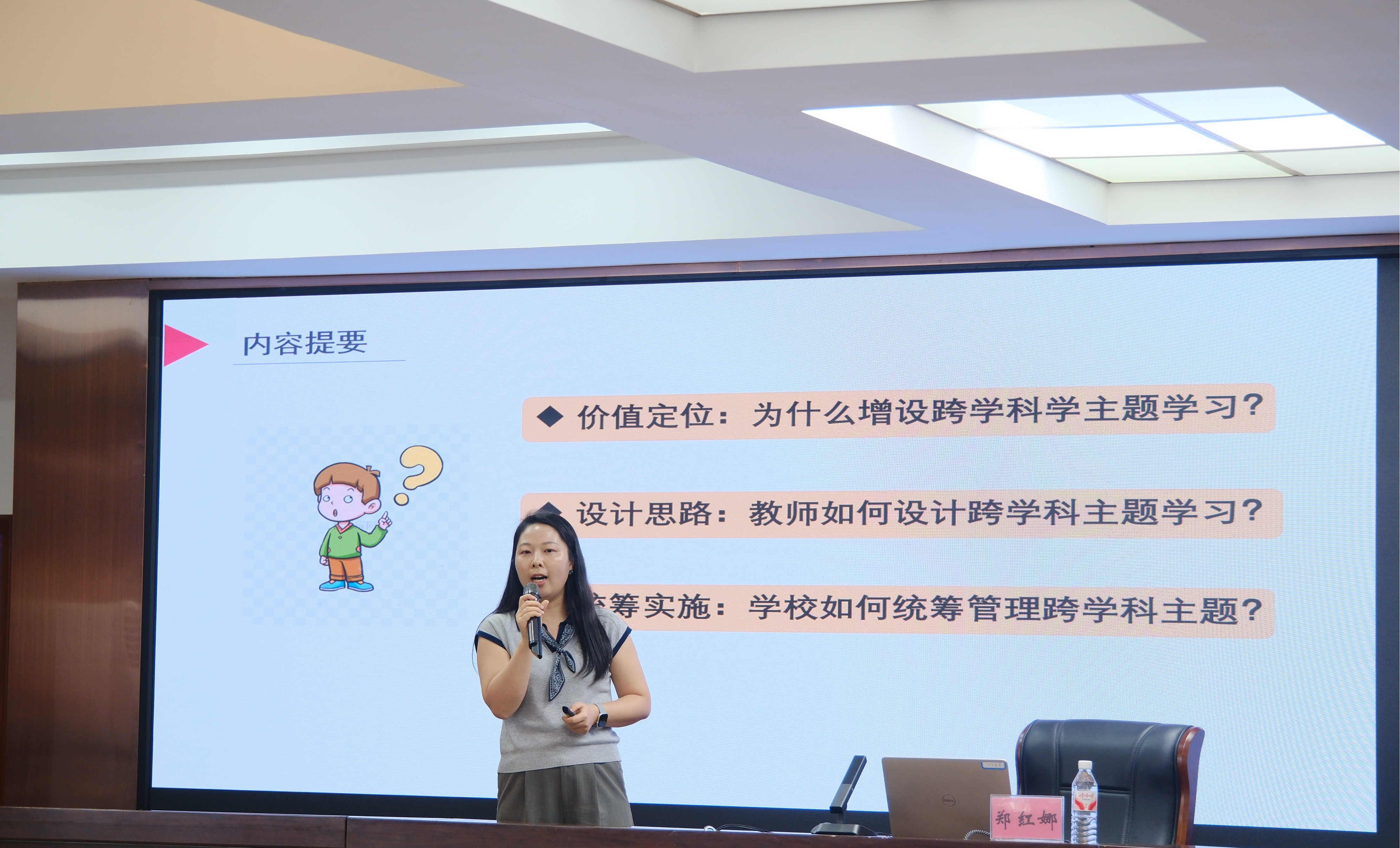 郑红娜以《跨学科主题学习:是什么?怎么做?——基于课程结构改革的视角》为题作专题讲座。郑老师通过阐明增设跨学科主题学习的核心意义、梳理“双基本位阶段——三维目标本位阶段——核心素养导向阶段”的发展脉络、解锁跨学科主题学习的特征和设计要素,为教师开展跨学科教学和学校统筹管理跨学科主题提供了可复制、可操作的具体路径。