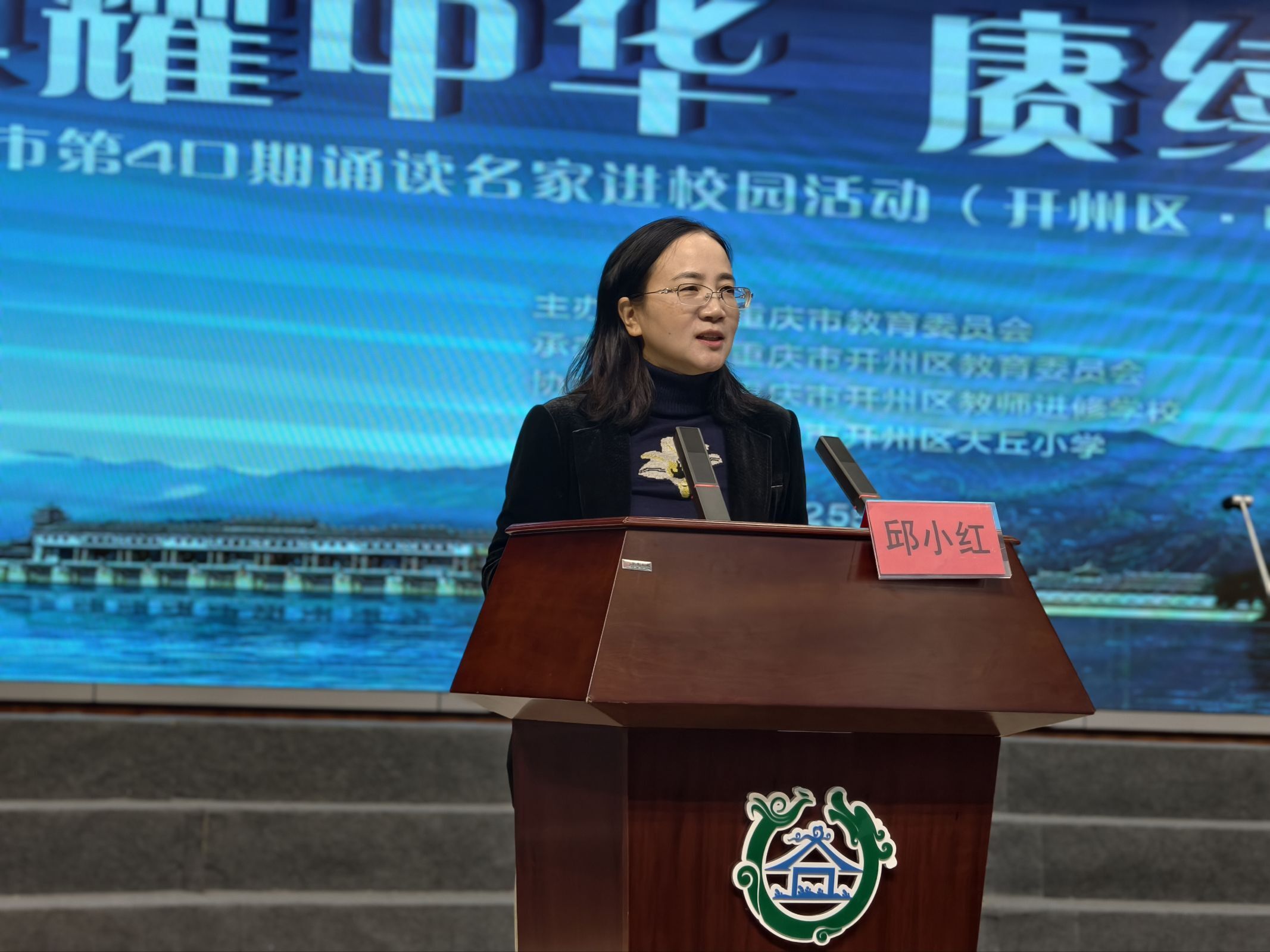 12月18日,重庆市“典耀中华赓续文脉”第40期诵读名家进校园活动在我区举行。重庆市教委教材和语言文字管理处处长邱小红,开州区委教育工委委员、区教委副主任王家全出席。