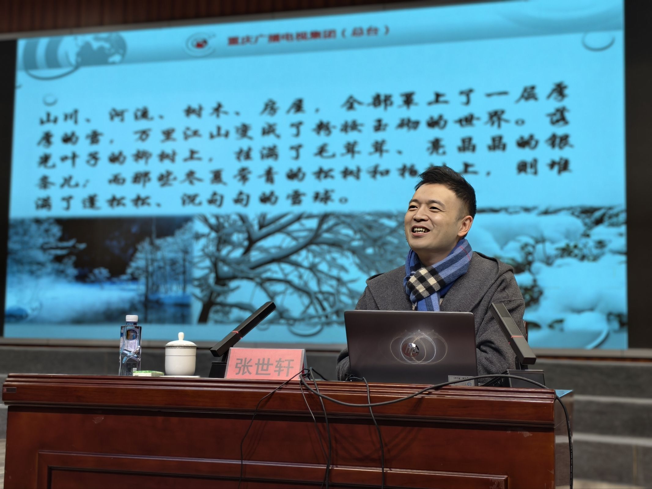 在大丘小学经典诵读培训专场,重庆广播电视集团(总台)播音指导张世轩作题为《倾听与言说:激活乡村内生动力的语言艺术》的专题讲座。他系统阐释诵读中的气息控制、情感融入与节奏把握,并邀请参会教师登台进行片段演讲,结合典型表达案例即时剖析,强化实战指导。在汉丰六小政策解读专场,汉丰六小教师詹静展示了诗词讲解课《送元二使安西》。该课例曾在重庆市第十一届中华经典诵写讲大赛中获小学教师组一等奖,并在全国第二届中华经典诵写讲大赛中荣获三等奖。