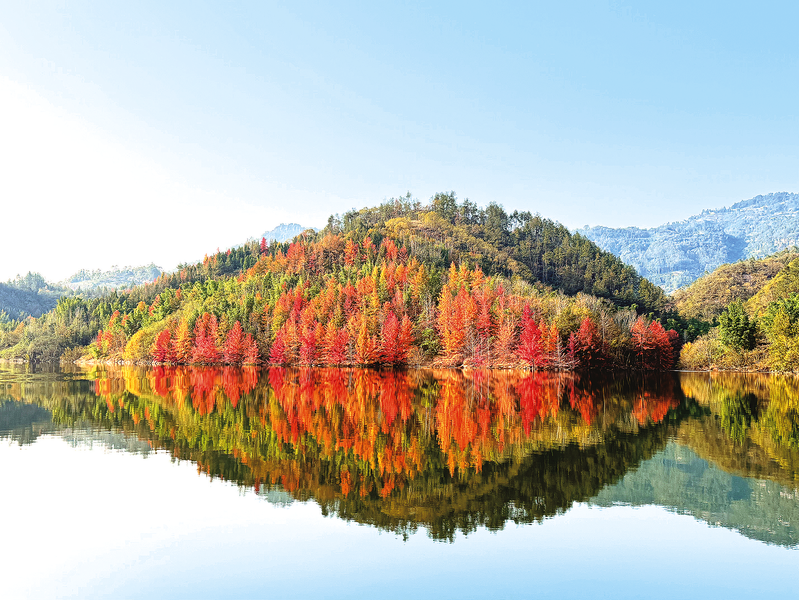 红叶“燃”遍山谷,人影漾在江中。山林之间,两岸红枫连片成林,红得热烈、橙得明艳。平静的小江宛如一面巨型明镜,岸边的红枫与远处的山峦倒映其中,形成“枫在水中生,水在枫间流”的奇妙景致。