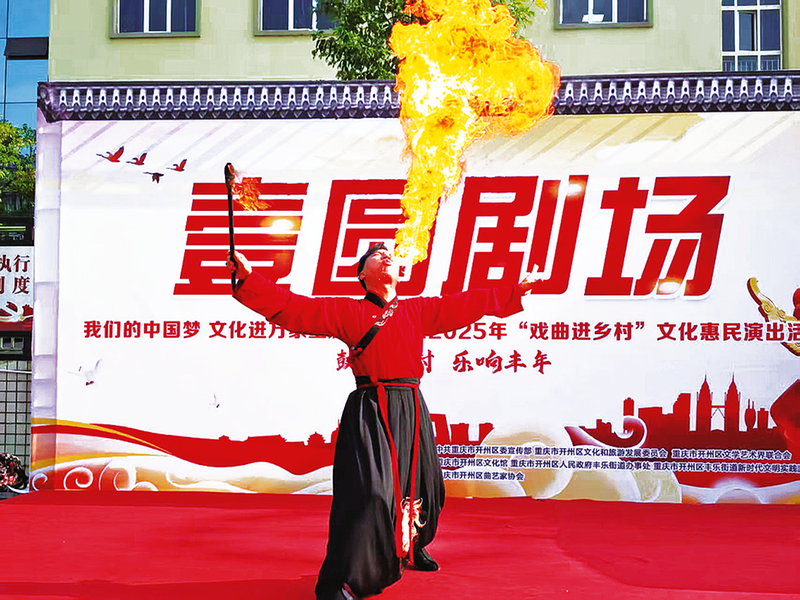 戏曲特技表演环节,喷火、变脸等绝活轮番登场,惊险刺激,引得观众目不转睛,纷纷举起手机记录精彩瞬间;幽默小品《单身汉的梦想》讲述乡村青年靠勤劳双手追求幸福的故事,妙趣横生,笑声不断;音乐快板《开州乡村振兴谱新篇》则以活泼的“数来宝”形式,生动讲述开州乡村产业兴旺、环境改善、民生提升的丰硕成果,句句勾勒乡村新貌,声声传递发展希望。