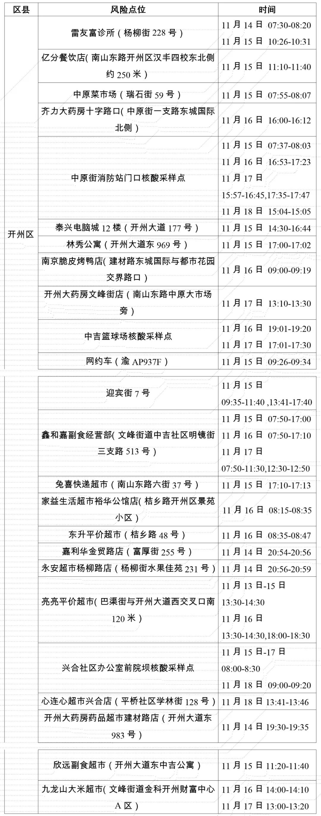 2022年11月19日,开州区新增报告4例确诊病例(均系隔离管控人员)、37例无症状感染者(26例系隔离管控人员,2例系重点人员核酸检测中发现的人员,9例系扩面核酸检测中发现的人员)。现将在渝主要活动轨迹的风险点位和时间通告如下: