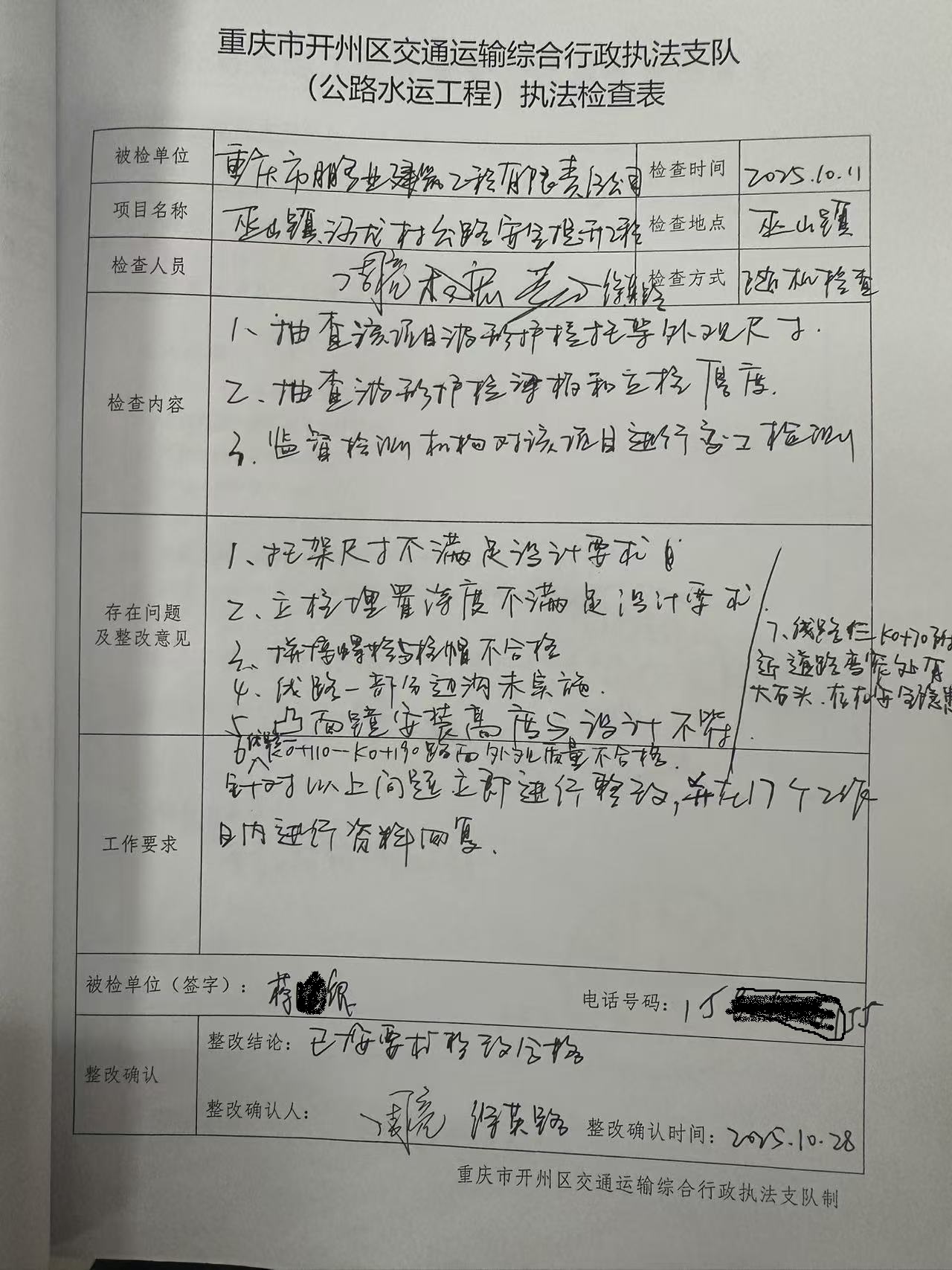 工程质量监督检查表(巫山河龙村公路安全提升工程)
