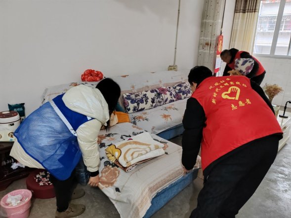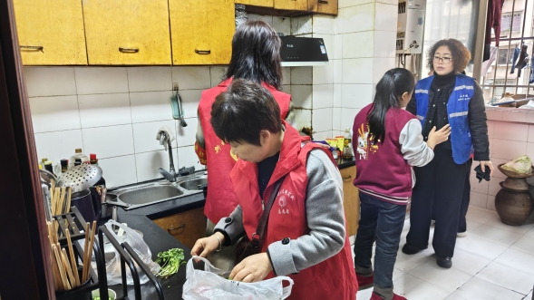 活动当天,参与志愿服务的有区农业农村委机关支部的党员代表,有光明骨科医院的医生和护士,还有汉丰街道凤凰社区的工作人员,共计20余人。志愿者们分成三个组分别前往安康社区不同的独居老人家中开展“送温暖”服务,为独居老人擦拭家具、清扫地面、洗菜做饭,对其家中水电气的安全使用进行检查,为他们测量血压、血糖,宣传老年病防控相关知识。
