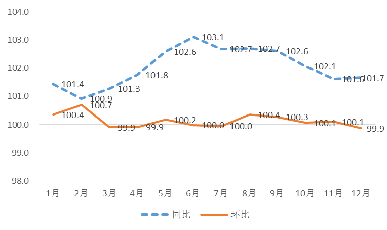 从环比看,全年波动趋势平缓。其中1-2月份受春节及严寒气候影响,鲜菜价格上涨显著,推动环比分别上涨0.4%和0.7%;3-4月,春节因素消退,鲜活食品及服务价格下跌,加之开学季和房交会高峰期过后,房租市场较低迷,环比均下跌0.1%;5月,受“五一”小长假效应影响,市民出行需求旺盛,旅游消费增加,加之临近端午,鸡蛋价格走高,影响环比上涨0.2%;6-7月,本地鲜菜、鲜果上市,影响外地调入量,带动环比指数走低,均与上月持平; 8-11月,疫情防控常态化导致人工、运输成本均有所增加,同时伴有高温干旱等多重因素影响,当月环比分别上涨0.4%、0.3%、0.1%和0.1%,12月,由于防疫政策优化,食品价格回落带动月度环比下跌0.1%。