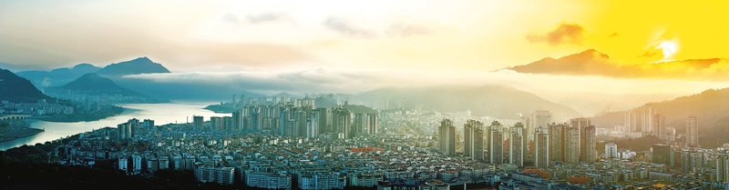 开州城沐浴在金色晨光中,远处的群山被薄雾笼罩,城市的高楼大厦显得格外壮丽,汉丰湖面闪烁着粼粼波光。在这清晨的美妙时刻,整座城市处处散发着独特而迷人的魅力,仿佛在以最好的姿态迎接崭新的一天。