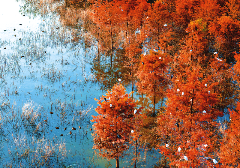 凛冬已至,赵家街道周都村浦里河畔却一派生机盎然。水杉林被时光晕染成斑斓画卷,红似火焰,黄如碎金;波光潋滟的河面上,成群候鸟翩然起舞,为这一湾碧水注满了无限诗意与浪漫。